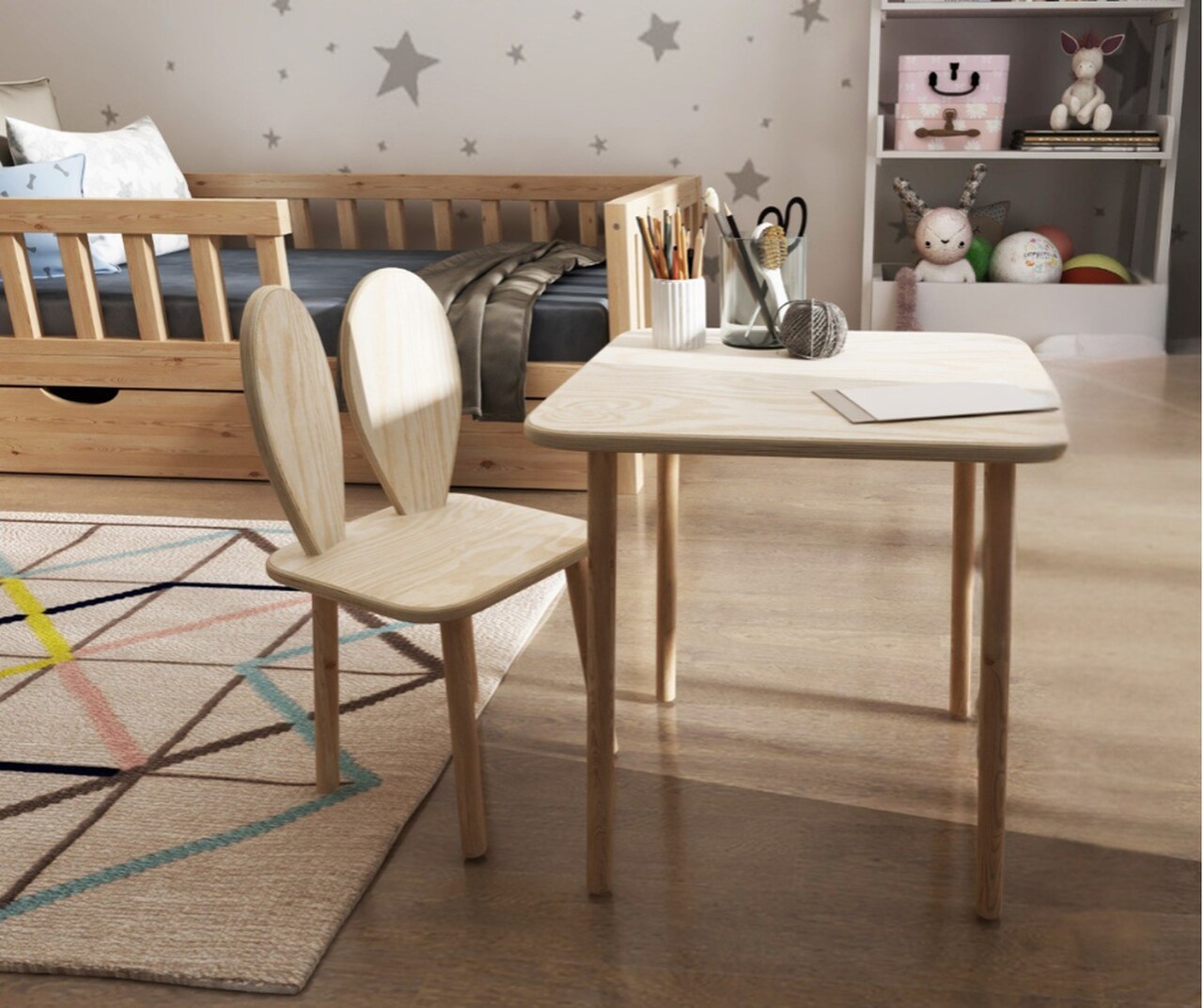 Krzesełko i stolik dla dziecka „Królik” oferują możliwość indywidualnej personalizacji. Dlatego idealnie dopasujesz je do aranżacji dziecięcego pokoju.