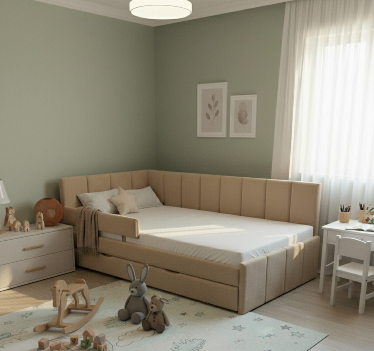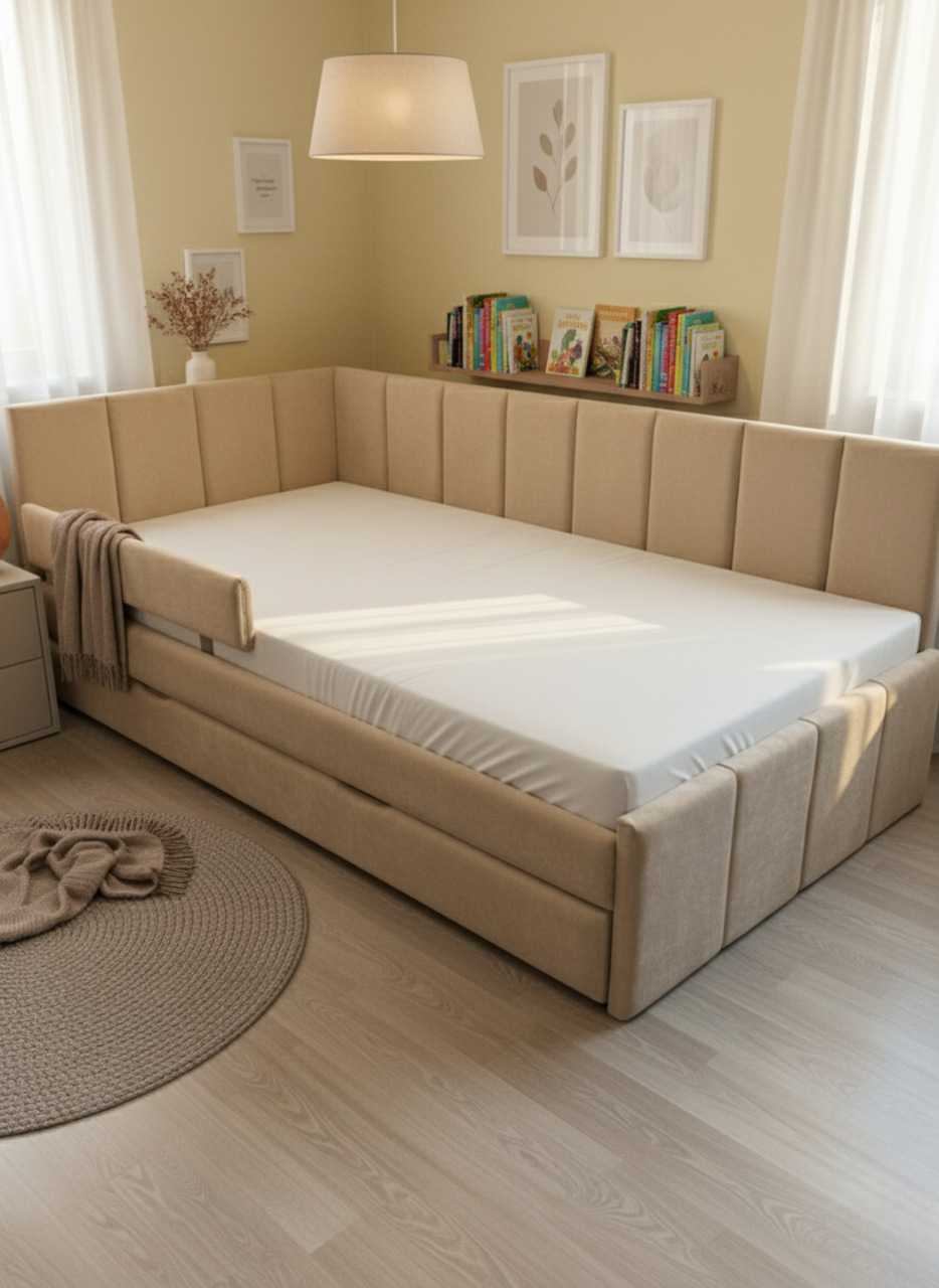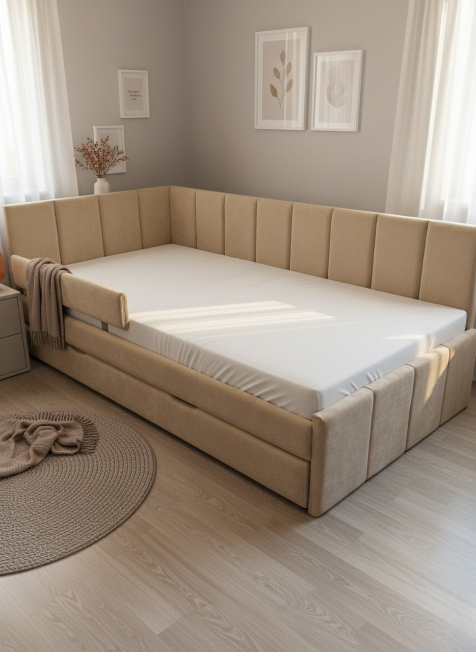 To tapicerowane łóżko młodzieżowe w kolorze ciepłego beżu zostało stworzone z myślą o rodzinach, które chcą połączyć estetykę, funkcjonalność i trwałość na lata.
